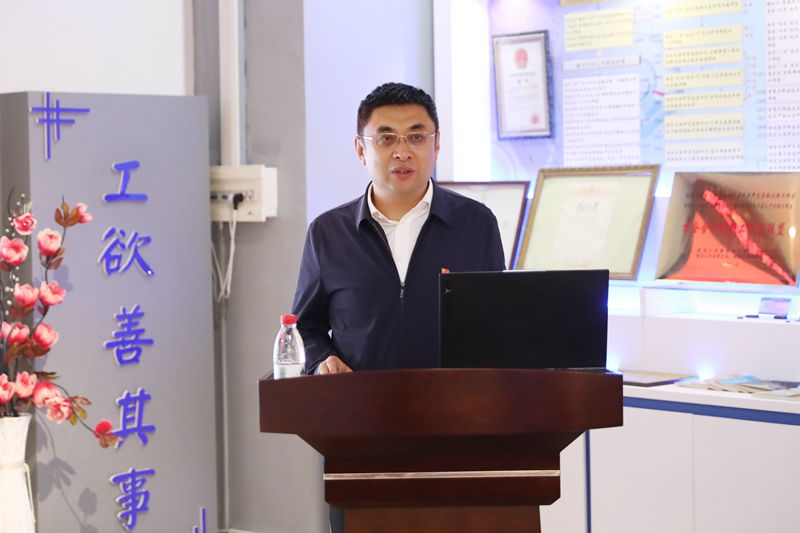 党课开始前,姜彬结合全国“工人先锋号”、党建工作样板支部和金属切削刀具馆进行展示介绍。(摄影:耿洪杰)